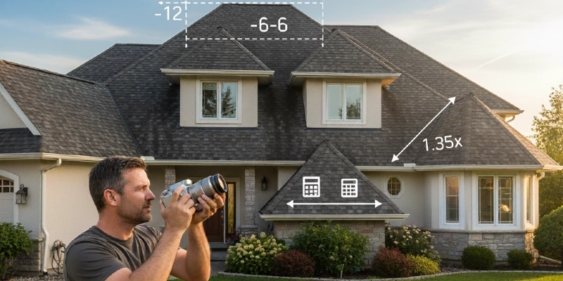- Next, count the number of rows of shingles between the gutter and the peak of the roof and then divide that number by two; this gives you the height measurement.
